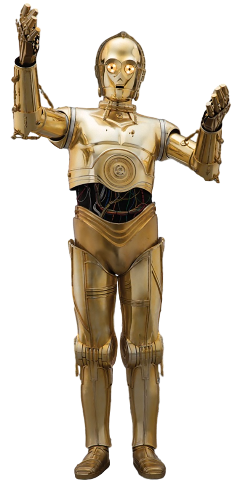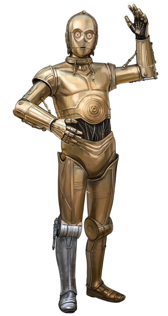 C-3PO, sometimes spelled See-Threepio, often referred to as Threepio and by some as 3-So, was a 3PO-series protocol droid designed to interact with organics, programmed primarily for etiquette and protocol. He was fluent in over six million forms of communication, and developed a fussy and worry-prone personality throughout his many decades of operation. Along with his counterpart, the astromech droid R2-D2, C-3PO constantly found himself directly involved in pivotal moments of galactic history, and aided in saving the galaxy on many occasions.