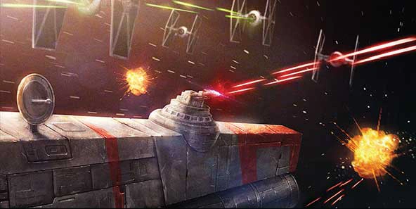 A C-ROC cruiser Corsair Refit with a turbolaser battery firing on an enemy fighter.