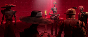 The trio made it to Serenno, where they met the Count. Both Bane and Hardeen demanded their payment, but instead Dooku asked them to take part in a special bounty hunter tournament that could gain them a much larger payment. The two reluctantly accepted with the Duros suspecting that it would be a deadly contest and that not all participants would survive. Bane then spotted the hat of fellow contestant Bulduga and asked the bounty hunter how he got it. Bulduga responded by drawing his blaster pistol, but the Duros was faster and shot the Ithorian in the chest, killing him in front of his brother Onca. Bane then mockingly took Bulduga's hat and dropped his old hat on Bulduga's body. Shortly thereafter Dooku gathered the contestants for a briefing on the tournament.[22]