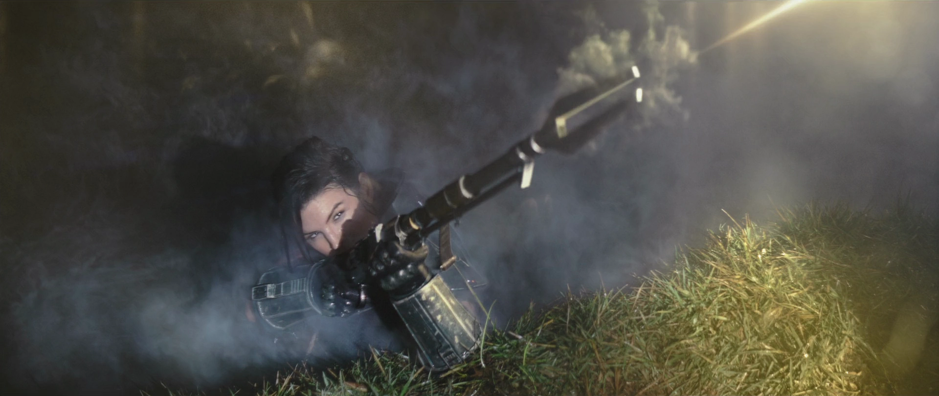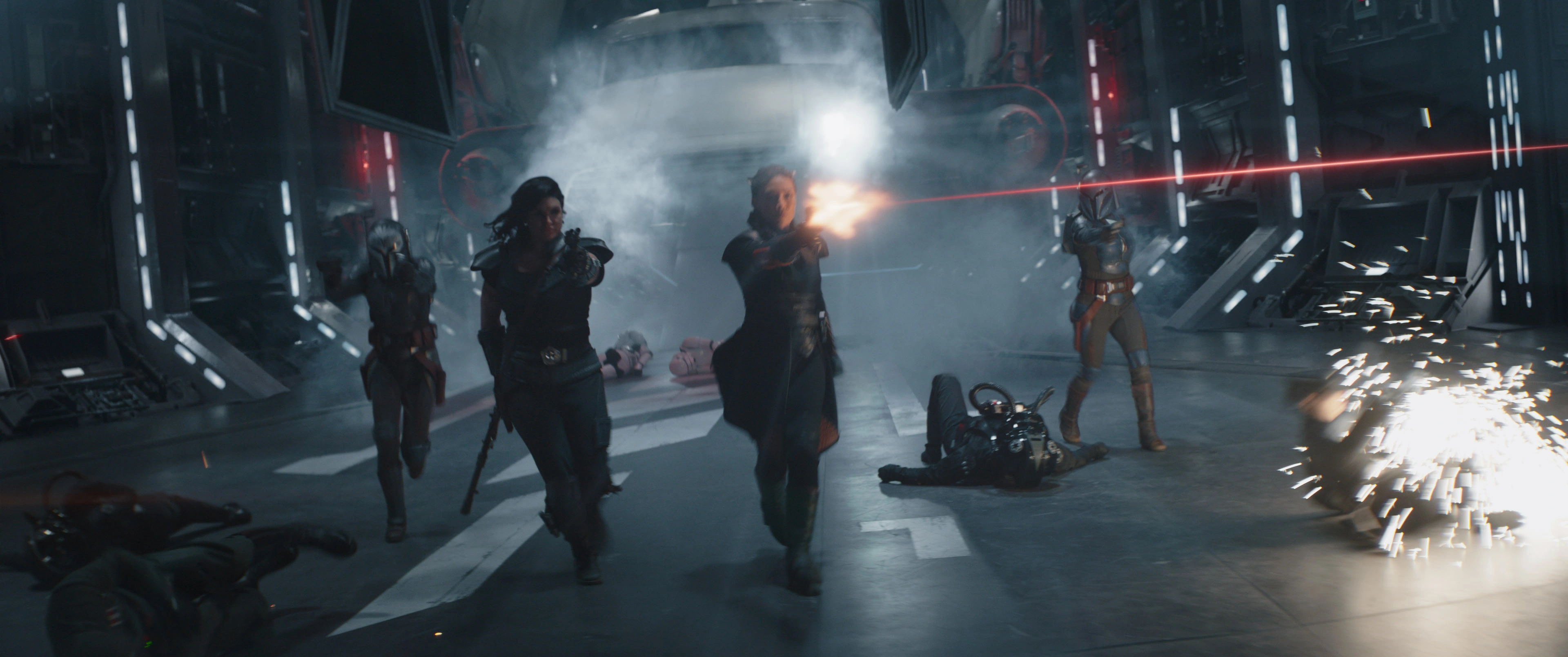After briefly stopping off to recruit additional help in the form of Mandalorians Bo-Katan Kryze and Koska Reeves, the group proceeded to infiltrate and storm Gideon's cruiser. Whilst Dune, Shand, and the two Mandalorians went for the bridge and Gideon, Djarin would head to the detention bay and free Grogu, as well as jettison the cruiser's complement of dark troopers before they could be activated. During their fight through the cruiser Dune's heavy blaster jammed and she briefly resorted to using it as a club before a good whack against the bulkhead got it working again. Reaching the bridge, they slaughtered all the defending troopers and officers but found no trace of Gideon. Djarin soon joined them, bearing a trussed-up Gideon and the Darksaber, which Bo-Katan had wanted to retrieve from him but which belonged to Djarin per Mandalorian custom of defeating the wielder in combat. Dune wanted Gideon alive so he could face the New Republic Judiciary, but the point was complicated when the dark troopers reboarded the vessel and prepared to storm the bridge, with very little hope of repelling them. A single T-65B X-wing starfighter then arrived, which did not raise Dune's spirits as she reckoned one fighter was not going to make much of a difference, only to watch in awe as a Jedi wielding a green lightsaber exited the fighter and proceeded to cut his way through each and every dark trooper on the ship. The arrival of the Jedi caused Gideon to panic and try to murder Grogu with a concealed blaster, then trying to kill himself when that failed, only for Dune to knock him unconscious with the butt of her blaster. She then watched as Djarin shared a helmetless goodbye with Grogu before letting him leave with the Jedi Luke Skywalker and his astromech droid, R2-D2.[16]