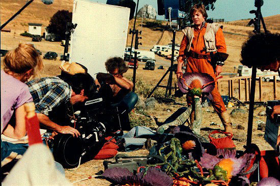 At Lucas's suggestion, an actual hang-glider was built and flown in the film by an actor in an Ewok suit.[10] Jon Berg designed the Gorax, which he portrayed with both a stop-motion model as well as himself in costume.[8] A scene shot for the film but deleted had Mace come across a group of large flowers. He sticks his hand in one of them, which then tries to pull him underground. This was replaced in the final film with a scene of Mace sticking his hand into a tree. The film also originally had a different ending in which the characters dance in snow.[15] Production Designer Joe Johnston commented on the film's special effects: "The effects we did were pretty primitive. We did forced perspectives and glass paintings, back-to-basics things that had been around since the 1920s. George just told us to go out there and have some fun."[3]