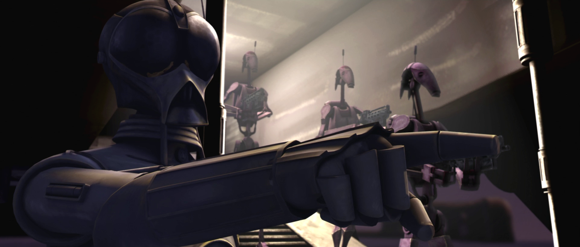 The role of caretaker droid was a position held by a droid tasked with looking after a location. During the Battle of Teth in 22 BBY, the RA-7 protocol droid 4-A7 claimed to be the caretaker of a B'omarr Order Monastery on the Wild Space world, though he was truly a spy droid for the Confederacy of Independent Systems. While Jedi General Anakin Skywalker and his Torrent Company initially believed the unit's lies, the droid's true loyalties were exposed when Jedi Commander Ahsoka Tano saw him with several B1 battle droids. She then turned her lightsaber on the Separatist droids, quickly taking out the combat droids and 4-A7 himself.