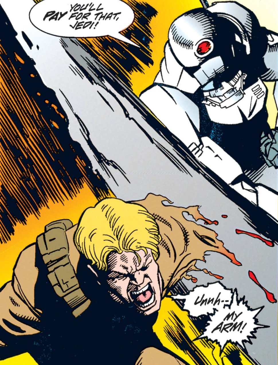 In the palace, the Jedi were fighting a group of security guards. Unable to see due to the darkness, Cay Qel-Droma was shot in the hand by a guard. Unable to defend himself, he could not prevent a guard from cutting off his left arm. Grabbing his brother, Ulic fled from the throne room, away from the skirmish. Cay Qel-Droma survived thanks to a medkit, and he bonded an XT-6 droid arm to his body to serve as a replacement limb.[3]