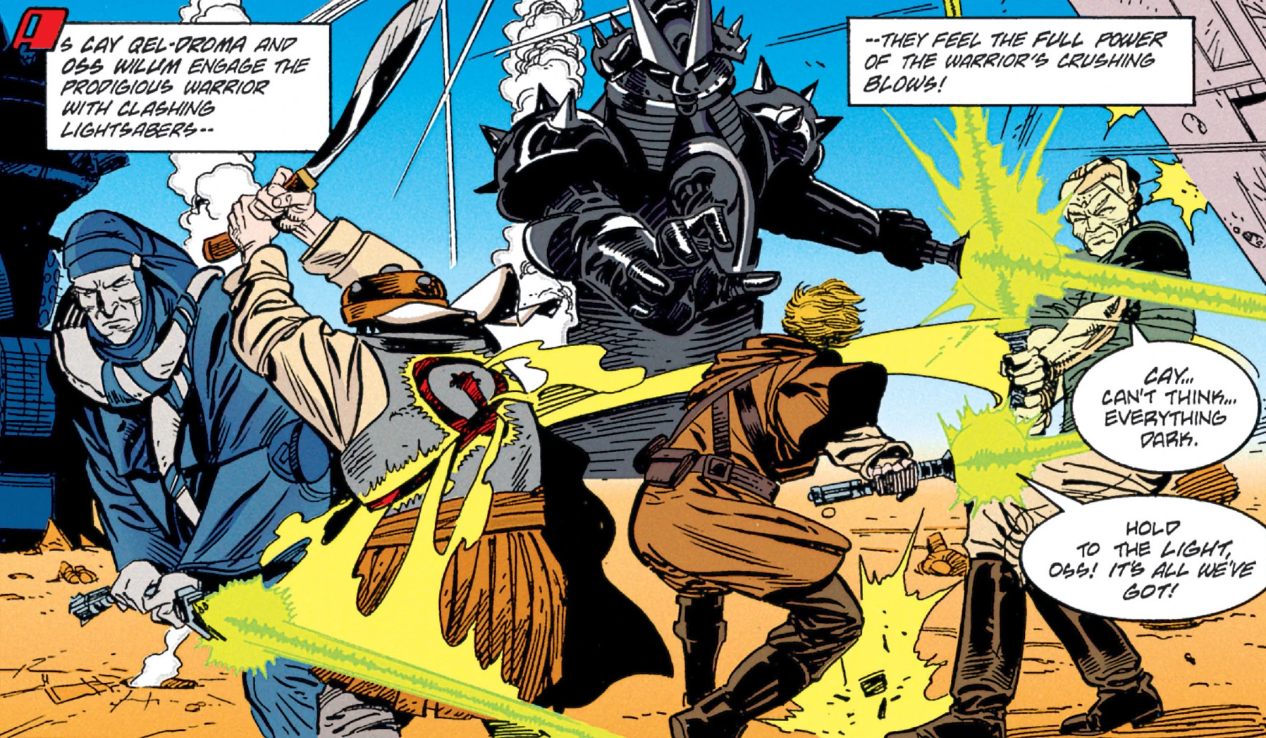 Back on Ossus, the Jedi planned for their next move against the Krath, still hoping to rescue Ulic. Cay Qel-Droma was involved in testing the new Star Saber XC-01 fighters along with Dace Diath. Following a test flight that seemingly killed Diath, Oron Kira arrived with his Beast Riders. Diath had not died but instead ejected at the last moment and used Force Levitation to save himself after the destruction of his fighter. The Jedi were planning another rescue mission, this time with the help of the Riders and their drexl mounts. However, before they could leave, the Masters wished to speak with them. Vodo-Siosk Baas and Thon informed the young Jedi that Ulic had to be the one to see the error of his ways, and turn from the dark side under his own volition. If he did not, he would destroy himself, as was the way of the Force. And so, with that fateful message, the Jedi prepared for departure. Flying Star Sabers and Stingers, they headed for Cinnagar, hoping to succeed where Cay Qel-Droma's crew had failed earlier. Once again, Sunrider and Qel-Droma would be the ones who would have the responsibility of speaking to Ulic while the other Jedi and the Beast Riders held the enemy at bay.[6]