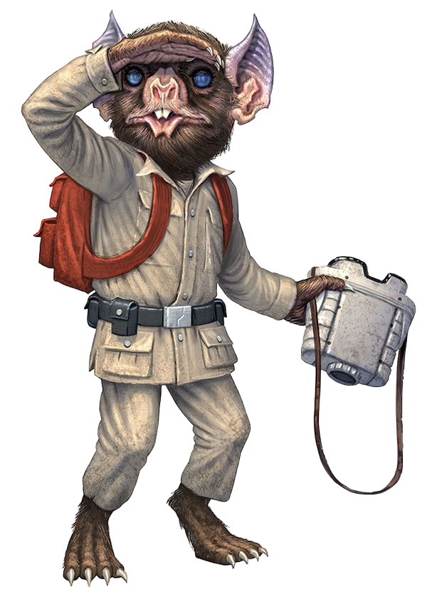 Chadra-Fans were a sentient rodent or bat-like humanoid species standing as a meter tall from the Outer Rim world of Chad. They were distinguished by their large ears, flat noses, and four nostrils.[7] Chadra-Fans could have black,[5] brown,[6] gray,[7] or white colored hair[3] and had gray,[2] tan,[4] or lightly colored skin. Possessing their oversized ears since childhood,[3] Chadra-Fans also had sensitive hearing.[2] Chadra-Fans had two hearts and only needed to sleep about three hours a day.[11] Chadra-Fan were capable of producing many offspring that were called fanlings.[3]