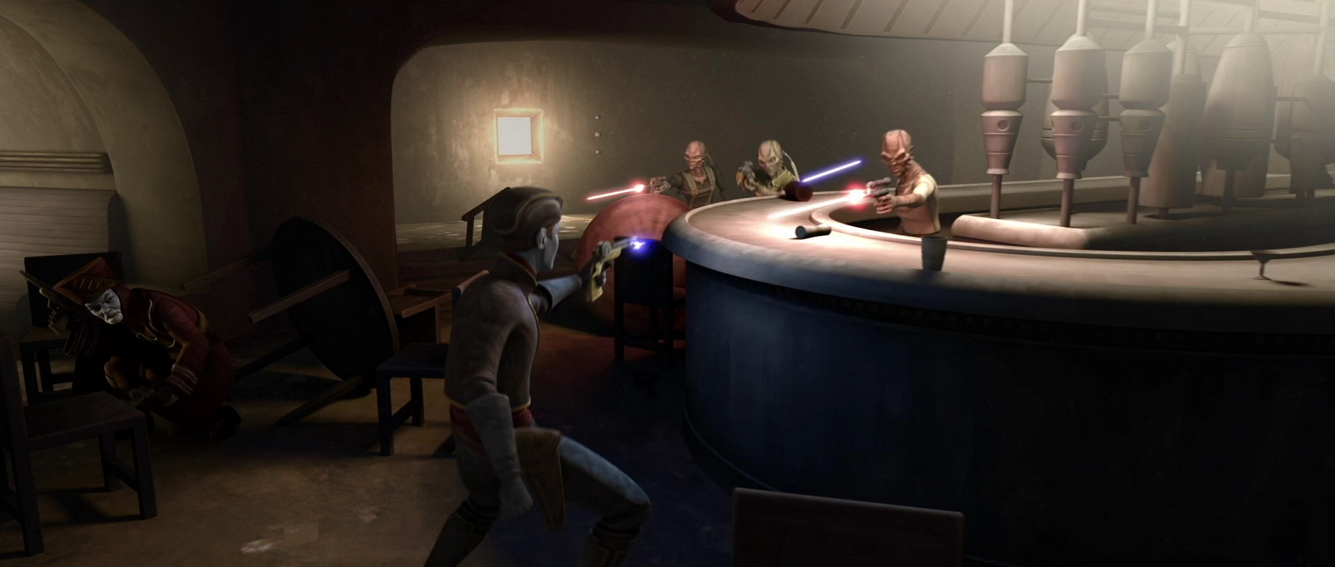 During the Blockade of Pantora, the seedy bar, at this point run by a Nimbanel bartender, was a known haven for criminals and lowlifes, many under the employ of Jabba the Hutt. Greedo, a bounty hunter hired by Trade Federation official Sib Canay, kidnapped Che Amanwe Papanoida, the daughter of Pantoran Supreme Chairman Notluwiski Papanoida, and held her captive in one of the cantina's back rooms. When Greedo was forced by Jabba to lead the Chairman Papanoida and his son Ion to the cantina, a firefight broke out in the bar between the three Pantorans and Greedo's associates.[6]