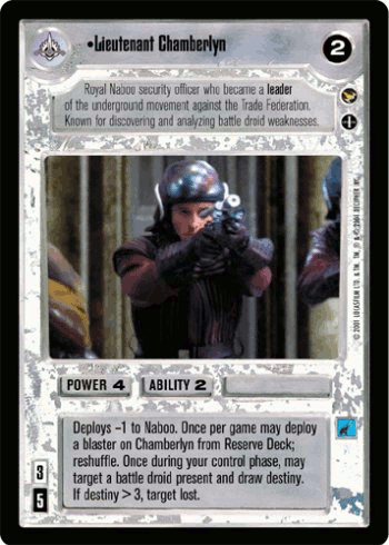 Star Wars Customizable Card Game — Theed Palace Limited Card: Lieutenant Chamberlyn (backup link) (First identified as Chamberlyn)- The Complete Star Wars Encyclopedia