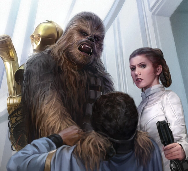 Upon the Falcon's exit from hyperspace, the group found themselves in a meteor storm produced by the destruction of the planet by the Imperial Death Star superweapon. The group were soon caught by the tractor beam of the battle station which was still looming in the system, but managed to evade capture by hiding in the Falcon's smuggling compartments. While Kenobi set out to disable the station's tractor beam in order to allow them to escape, Skywalker was told by R2-D2 that Princess Leia Organa was being held in Detention Block AA-23, her execution scheduled. They set out to rescue her, with Chewbacca posing as a prisoner of stormtrooper-disguised Skywalker and Solo. Despite encountering trouble, Chewbacca and the others managed to escape from the Death Star—except for Kenobi, who had died in a duel with Darth Vader. The Falcon soon arrived to Yavin 4, landing on Rebellion's secret base, just as the Death Star closed in on the moon.[4]
