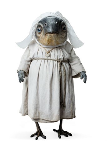 Alcida-Auka, a female Lanai from Ahch-To, wearing a simple white habit with a gray rope fastened around her waist as a belt.