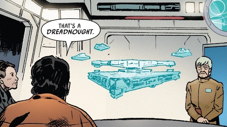 - "Comm/scan reports three Resurgent-class Star Destroyers and a larger capital ship. Unknown class, Dreadnought-sized. Preliminary estimated length seven thousand five hundred meters."