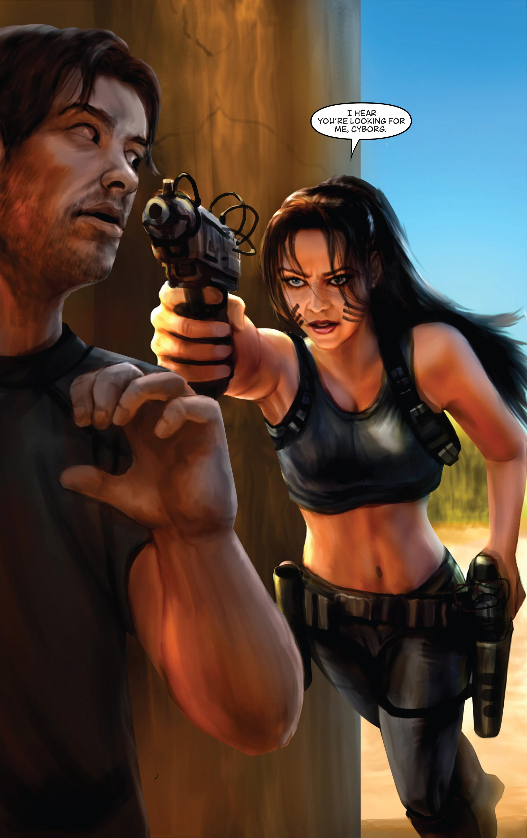 Several weeks later, Connor saw another HoloNet report citing him as a prime suspect in the string of murders of Fett's killers. A stormtrooper then burst into the bar and dragged him out into the street as Connor cried innocent. That was not what the stormtrooper wanted, however, and Connor was knocked unconscious as a warship attacked the bar, destroying it completely.[6] Waking up in a bacta tank in Cornelius Evazan's lab, Connor discovered that his arm had been lost in the explosion and replaced by a cybernetic one. On his ship, the stormtrooper revealed himself to be Boba Fett, alive and well. Fett then explained how he survived his assassination attempt and used Connor's identity to track down and kill several of his assailants in an effort to track down who sent them, and that Quinney was okay. He then left Connor on Concord Dawn to find and protect Sintas Vel as Fett continued his search.[3]