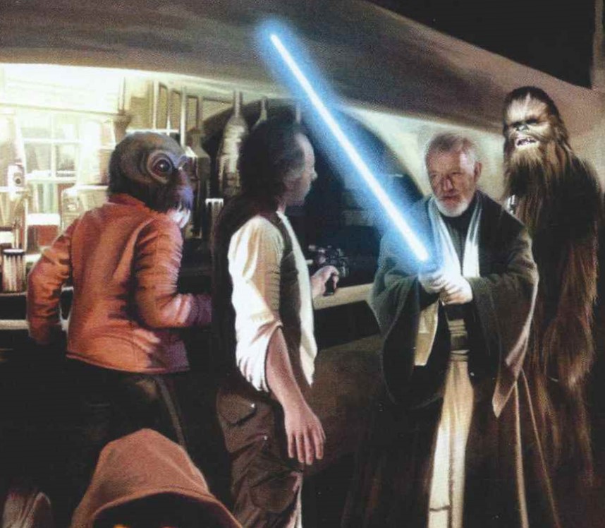 However, paying little heed to the old man,[1] Evazan angrily hurled the young farmboy into a nearby table, and, ignoring Wuher's protest, the pirates drew their blaster pistols. Given no other choice, the elderly Kenobi—in secret one of the few remaining Jedi Masters—ignited his lightsaber[3] and cut a deep slash in Evazan's chest, causing the doctor to fall back against the bar[37] screaming in pain. Kenobi then used his lightsaber to sever Baba's right arm, effectively disarming the pair before they could fire their weapons.[3] The two survived the lightsaber strikes, as the blade had simultaneously cauterized their newfound wounds,[9] Evazan supported the injured Aqualish on the cantina floor.[38]