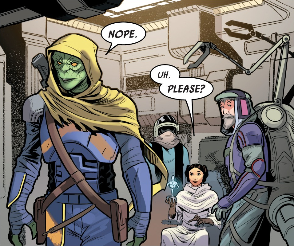 Evazan, disguised as Leia Organa, is initially turned down by Nokk.
