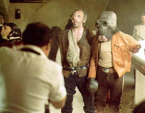 Doctor Evazan and the armless Ponda Baba pose on the cantina set.