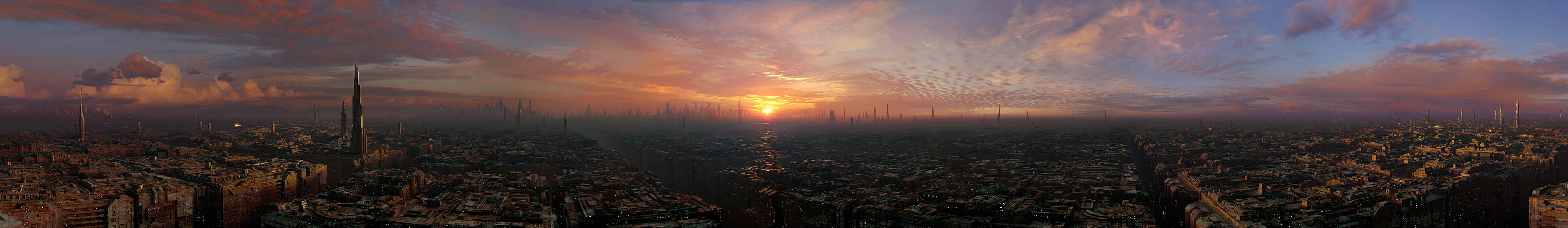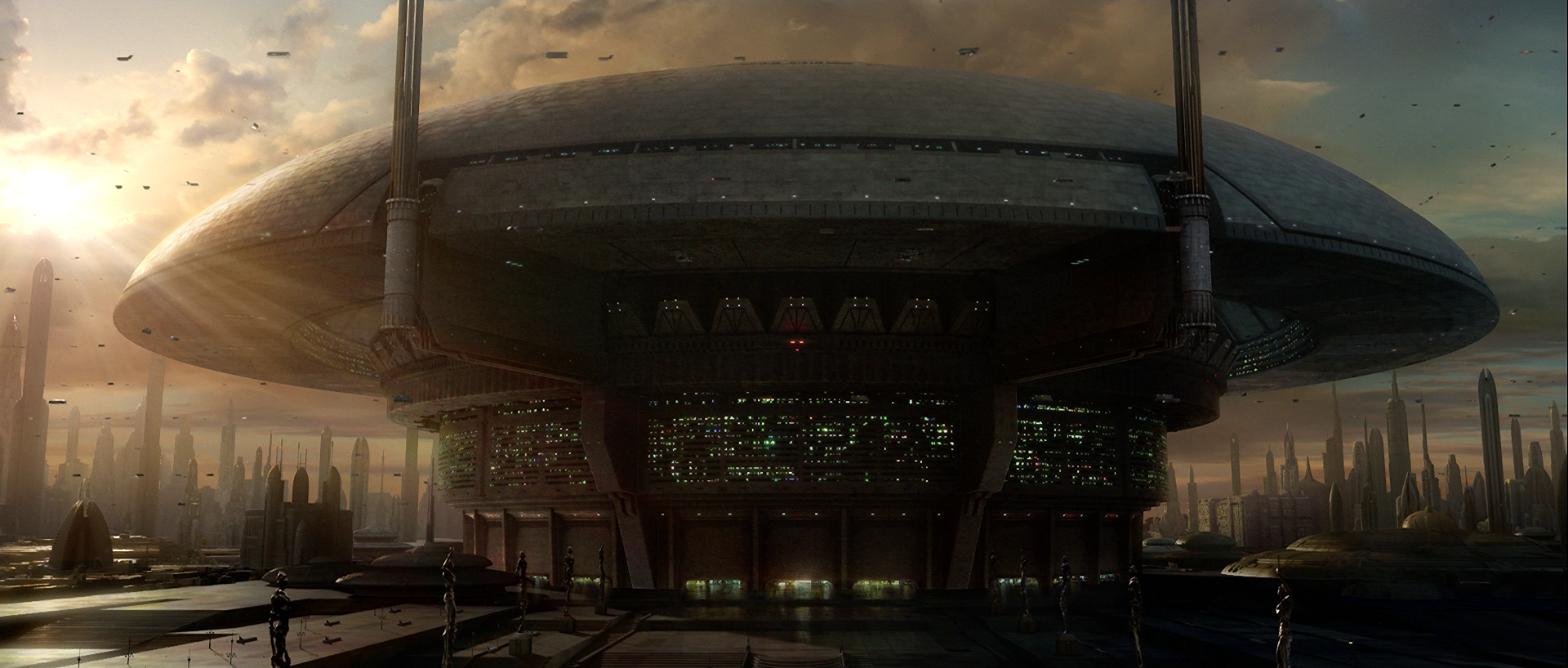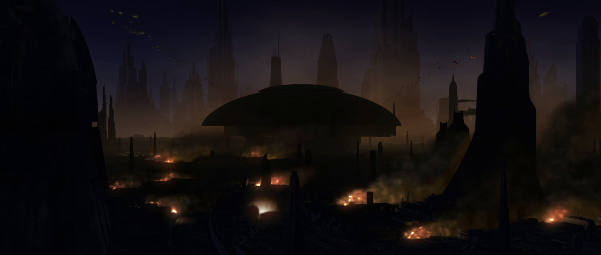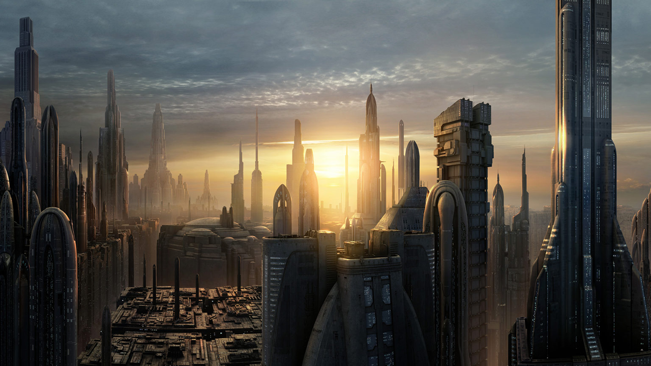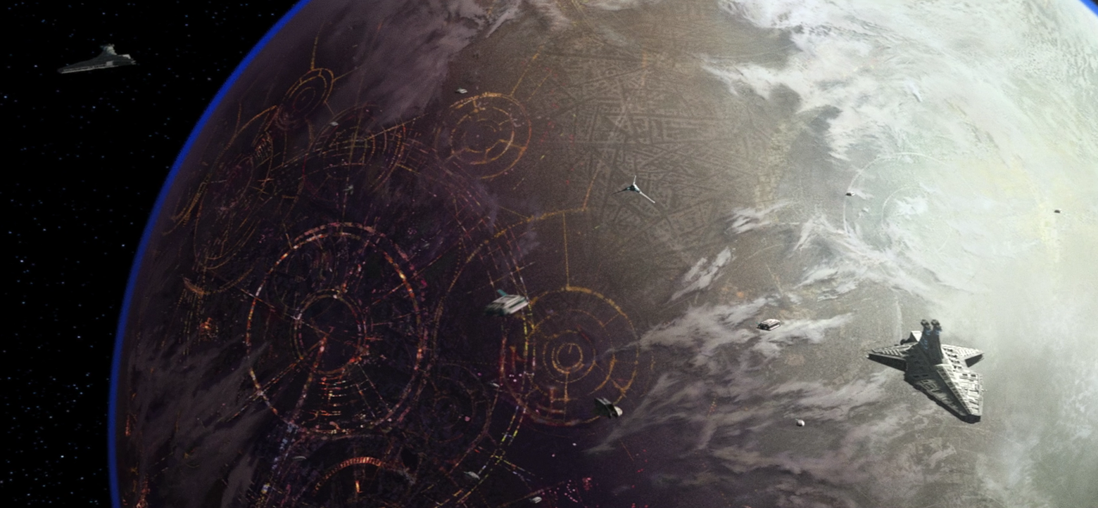 The surface of Coruscant featured towering skyscrapers and streams of speeder-filled air traffic.