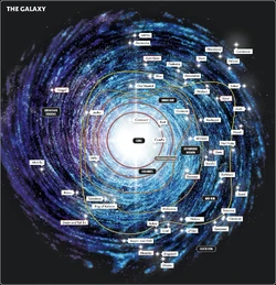 Small reptiles used as cues in a roulette game played on Coruscant evolved through mutations they experienced in the planet's gutters. Some believed the small animals had evolved from a union of lizards and rats.[57] There were 24 hours in a Coruscant day, and 365 days in a Coruscant year.[10] Owing to its importance in galactic history, the galaxy used a dating system standardized on Coruscant,[58] and the planet's galactic coordinates were 0-0-0 despite it not being the exact geographical center of the galaxy.[5]