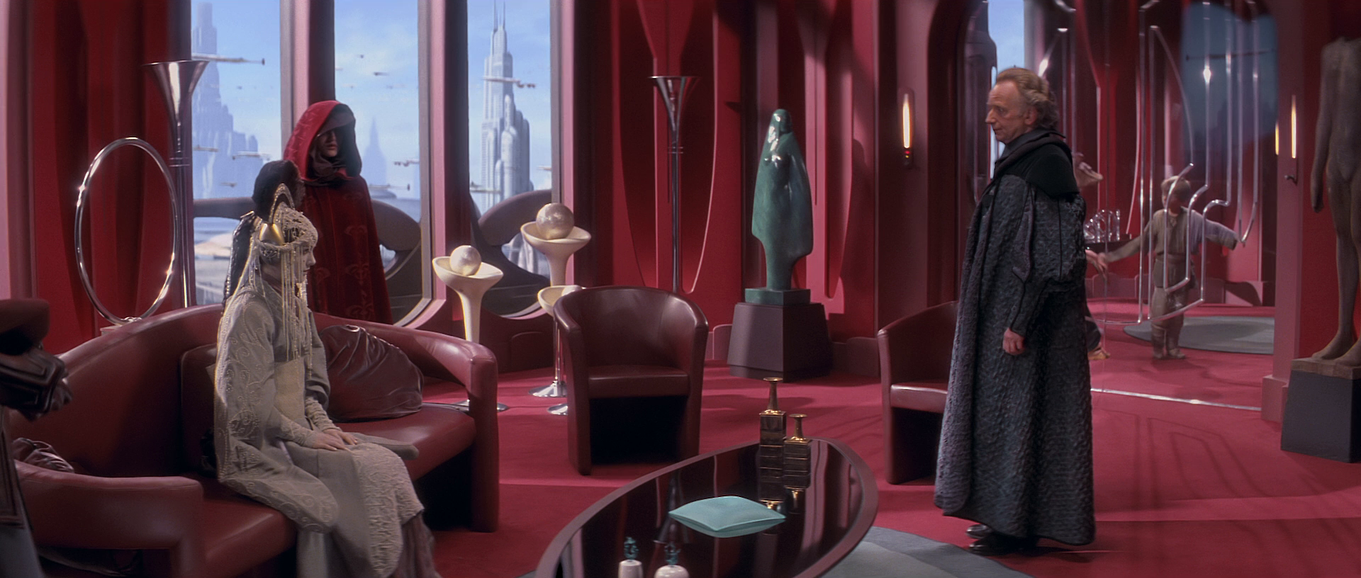 Directly adjacent to the Senate Building was the Senate Office Building. The executive building had docking bays that wrapped around the building, allowing Senators to land their private shuttles and walk inside. The building contained mostly offices and meeting rooms for members of the Senate but also held the offices used on a day-to-day basis by the Supreme Chancellor. During Palpatine's term, the Chancellor's office was decorated with red floors and walls as well as several statues. A lobby led to the Chancellor's public office, which contained a grand desk and large window that overlooked the cityscape. To the side, another hallway led to Palpatine's inner private office.[37]