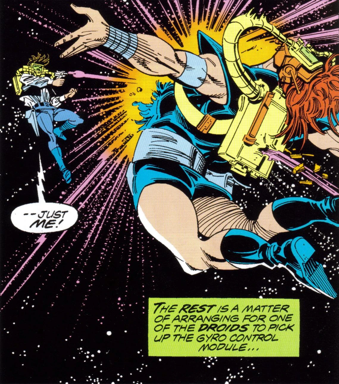 Convinced by Solo's story, Crimson Jack decided to head to the Drexel system. However, his navigation computer had no information on how to get to there. To guide Jack's crew, Solo had Chewbacca tap into the ship's computers to show the way. Jack was quite suspicious of the action, and he had two of his men keep close watch on the Wookiee with orders to kill Chewbacca if he tried anything not related to guiding the ship to the Drexel system.[3] However, even with the guards on him, Chewbacca was able to delete the ship's star charts, an action that had been planned by Solo to give them the upper hand.[1][5] On the way to the Drexel system, Crimson Jack was forced to discipline his first mate, Jolli, who had opened fire on her fellow crew members for attempting to kiss her. Jolli blamed the outburst on Solo, whom she had only recently began to fantasize about. Jack was bewildered by the confession, knowing that Jolli had a reputation as a man-hater, and exclaimed that he could not understand the effect that Solo had on women.[5]