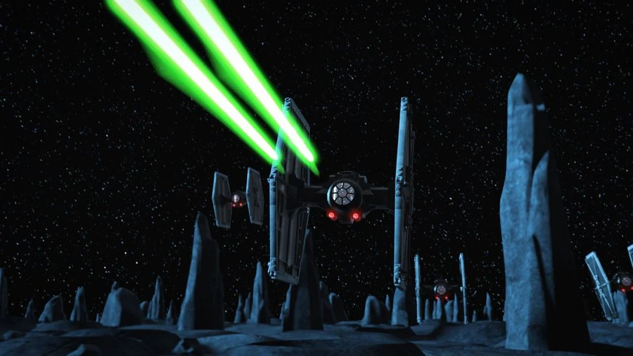 The episode opens with Luke Skywalker and Leia Organa flying a Y-wing starfighter that is being pursued by several TIE fighters. Their Y-wing's rear deflector shield is hit and their two A-wing starfighter escorts are also destroyed. In an attempt to lose the TIE fighters, Luke flies the Y-wing through the surface of a pinnacle planet. One of TIE fighters collides with a pinnacle but the pilot survives and lands on the Y-wing's canopy. He tries to force Luke to surrender but the Jedi pilot uses the windscreen wiper to throw him off.