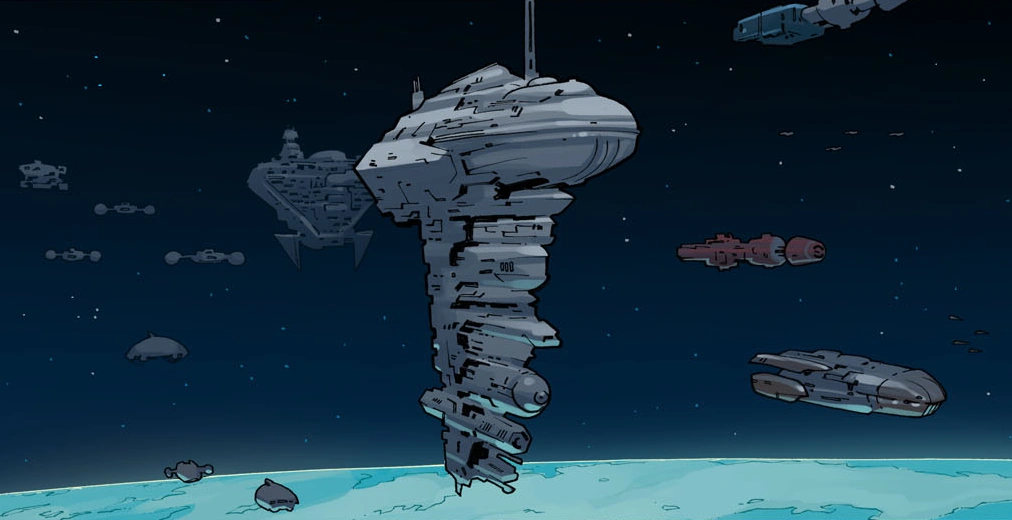 The DP20 Frigate first appeared in the 2016 canon Marvel comic Star Wars (2015) 23, which was written by Jason Aaron and penciled by Jorge Molina. The shot of the Alliance fleet in which two DP20s appear seems to have been based[3] on a very similar shot from the Star Wars Legends video game Star Wars: The Force Unleashed II.[6]