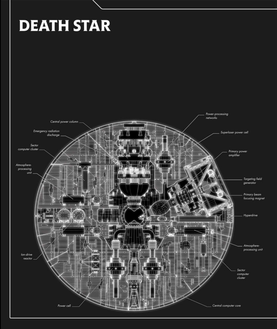 The DS-1 Death Star Mobile Battle Station, also designated as the DS-1 Orbital Battle Station and referred to as the Ultimate Weapon in early development stages and later as the Death Star I and the First Death Star, was a moon-sized, deep-space mobile battle station constructed by the Galactic Empire. It had been designed to fire a single planet-destroying superlaser powered by massive kyber crystals which would destroy any planet targeted. It was the pet project of Emperor Palpatine, Director Orson Callan Krennic, and its eventual commander Grand Moff Wilhuff Tarkin to expound the military philosophy of the aptly named Tarkin Doctrine.