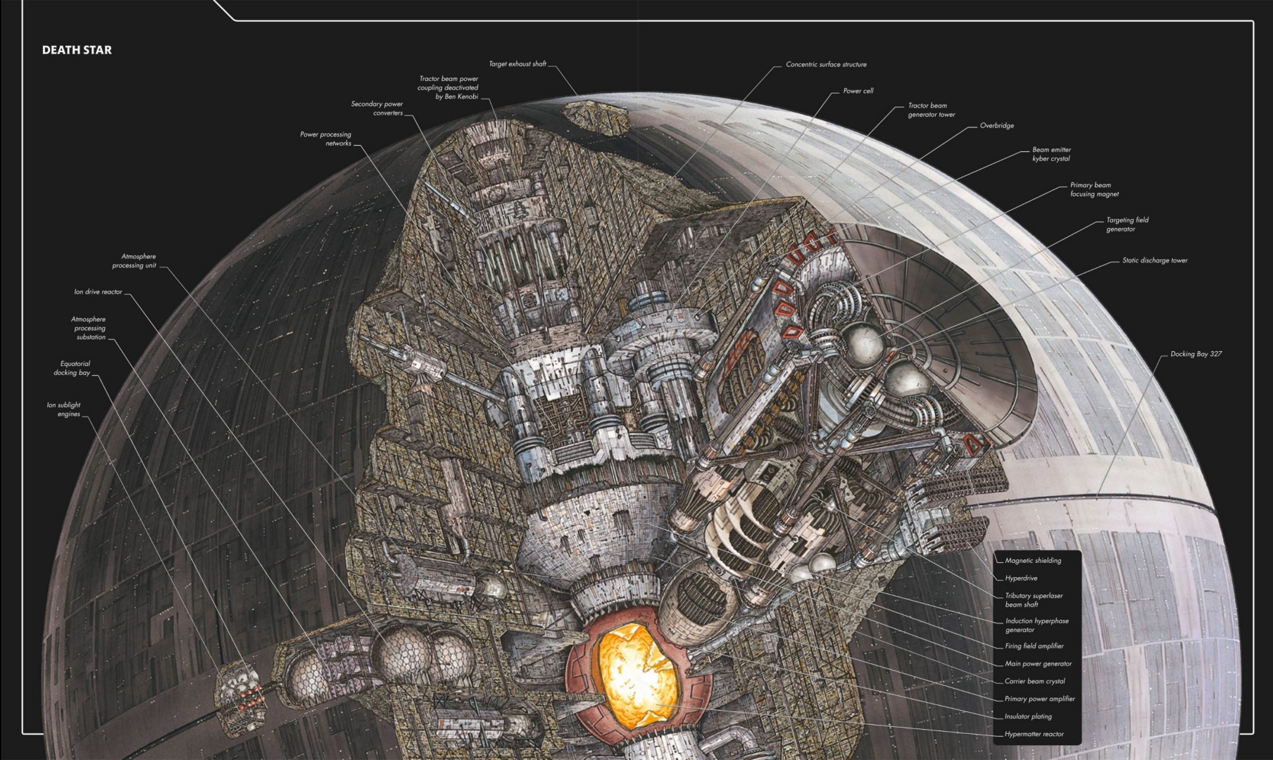 A habitable crust several kilometers thick was composed of command centers, armories, maintenance blocks, and other requirements for a fully operational space station.[4] Unused stories in the station's lower levels held backup weapons operators in the event of an emergency. Levels in the station's southern hemisphere extended downward through armories, deep storage, and a southern command sector. Massive girders provided grid-like support to the lower levels. Cranes and other abandoned construction material could still be found within the station by the time of its destruction in 0 BBY.[15] With the exception of the crust, the station's entire interior space was uninhabited, and housed the hypermatter reactor, hyperdrive, 123 Kuat Drive Yards sublight engines,[8] and the station's superweapon.[4] The station's outer hull was made of quadanium steel plates.[14]