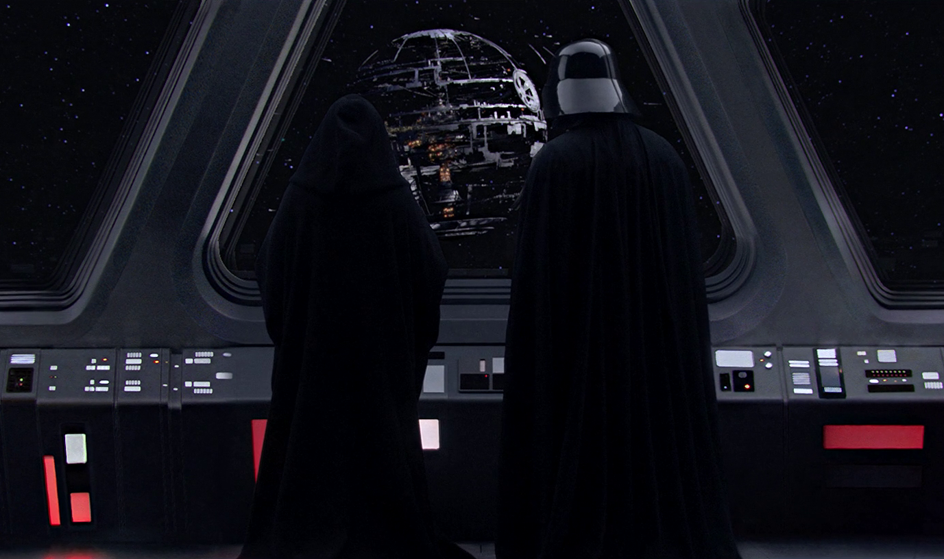 The Emperor and Darth Vader observe the construction of the Death Star.