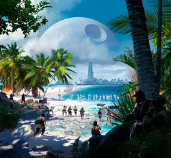 The Tarkin Initiative, an Imperial think tank, was responsible for some of the ideas behind both the first and second Death Stars.[35] While many starship designers and engineers attempted to claim credit for the station's construction, none besides the Emperor knew the full history of the moon-sized project. While rumors within the Imperial ranks speculated that it was a Confederate weapon engineered by Geonosian Archduke Poggle the Lesser's hive colony for Count Dooku, none could prove the story's validity. Some pointed out, however, that the plans must have fallen into Republic hands before the Clone Wars ended, owing to the station's shell and laser-focusing dish already in the works upon the war's conclusion.[14]