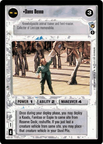 Upon reaching the end of the plaza, Binks attempted to dismount from his kaadu, but got his foot caught in a stirrup. Denna then moved forward and grabbed the kaadu's reigns,[2] helping Binks[1] before the animal trainer led the kaadu away. At the event, Denna wore a green outfit including a tunic, pants, and boots. They had light skin and brown hair.[2]