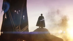 After Grogu's capture, Djarin located Bo-Katan and Reeves and recruited them to help rescue him. Bo-Katan agreed to help after Djarin promised her the Darksaber. After a successful raid of Gideon's cruiser by Djarin, Bo-Katan, and their associates, Djarin defeated Gideon in a duel and wrested the Darksaber from him. He brought the captured moff to the bridge and tried to give the weapon to Bo-Katan, but she refused to take it. Gideon laughed at Djarin's ignorance as Bo-Katan explained that she had to win it in battle. Djarin attempted to yield, intending to make good on his promise and wanting to avoid trouble, but Bo-Katan only stared at him coldly and yet again refused. However, before their conflict could continue, the group was forced to arm themselves to repel Gideon's dark troopers. Eventually, the Jedi Luke Skywalker arrived to save them, taking Grogu with him to be trained in the ways of the Force.[7]