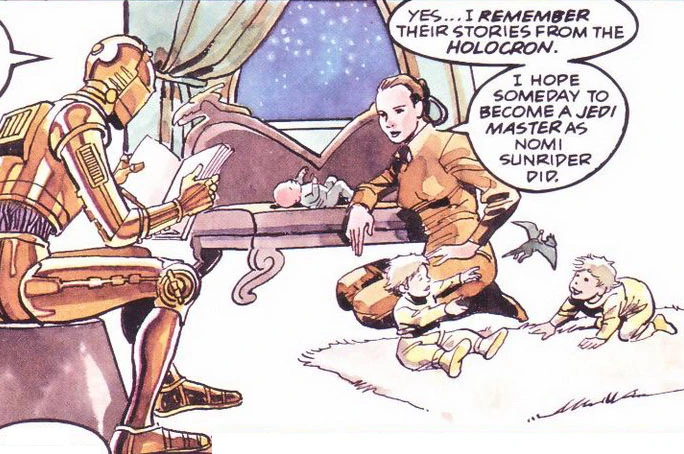 The children were raised in the Solos' Imperial Palace suite, with Organa Solo's adoptive sister Winter serving as their nurse.[1] Their uncle, Luke Skywalker, tested their Force potential and found it astonishing.[25] Shortly after their birth, they were the targets of another kidnapping attempt by an Imperial Intelligence team. Trapped in their suite, they were nearly captured before smuggler ally Mara Jade intervened and saved the family. After that incident, when the Solos, the Wookiee Chewbacca—who owed the Solos a life debt—and Skywalker had to leave Coruscant on a mission that saw the defeat of Thrawn and C'baoth, they were left with Winter and a cadre of Noghri bodyguards, having sworn their lives to the defense of Vader's line.[1]