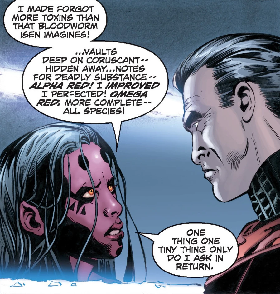 Maladi was later found inside a Vong ship in a comatose state by an Imperial frigate loyal to Roan Fel. Hogrum Chalk, the Emperor's head of Intelligence had her secretly transported to and imprisoned on Bastion, where she later awoke in what seemed to be a fragile, paranoid state of mind, the aftermath of Skywalker's mental attack. She requested an audience with Emperor Fel with claims that Darth Krayt had survived despite her attempts to ensure his demise, and appealed for safehaven from the empire-in-exile. She offered him Omega Red, a biotoxin she claimed was capable of killing a planet—in exchange for the head of Cade Skywalker. Her sincerity was questioned by Fel, who was hesitant to unleash such devastation and threatened to instead deliver Maladi into Skywalker's hands. Chalk, however, considered the weapon as an opportunity to end the war and save countless lives by sterilizing Korriban of all Sith. The Emperor refused to be branded a pariah in the galaxy for employing the same techniques as the enemy. He ordered Chalk to keep Maladi's capture in secret, and she was left in her cell.[28]