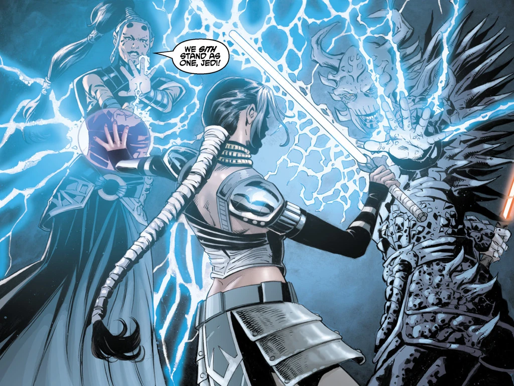Alongside Darth Krayt, Darth Maladi battles Celeste Morne.