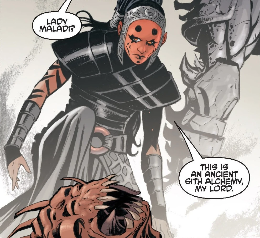 Darth Maladi, born Malincha, was a Force-sensitive Devaronian female who was taken by the Sith from her homeworld of Devaron following the death of her Jedi father at the hands of Dark Lord of the Sith Darth Krayt. She was trained in the dark side and became a prominent Sith Lady in Krayt's One Sith Order. Maladi specialized in the ways of inquisition, torture, and mental manipulation, all skills which she implemented in her service as the head of Sith Intelligence and Assassination. She was also a talented scientist who experimented with ways to pervert science to serve the Sith cause. Maladi manufactured and dealt the narcotic ixetal cilona, and was also the mastermind behind the sabotaging of the Galactic Alliance-sponsored project to terraform the Jedi world of Ossus.