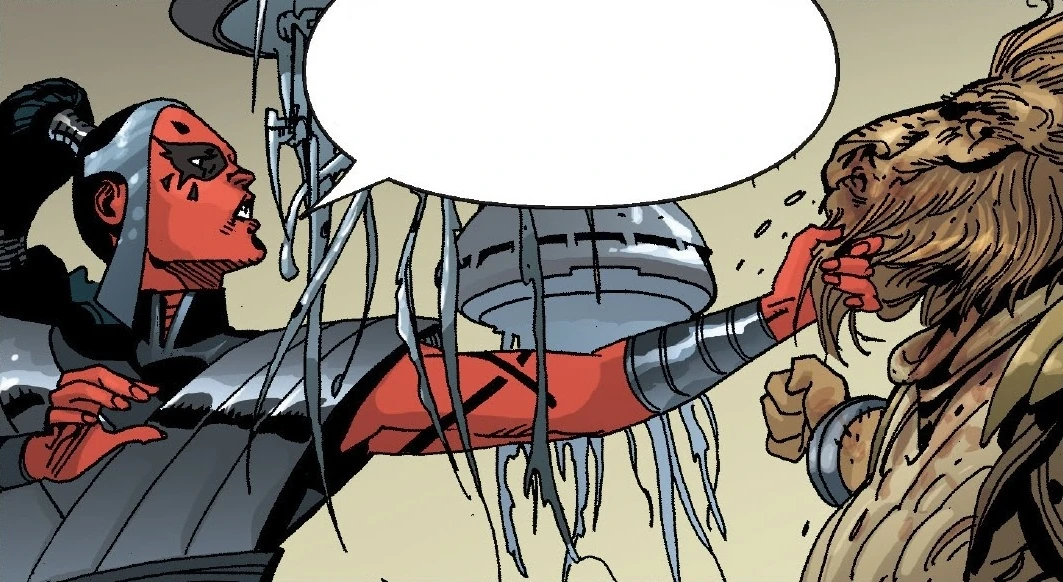 Krayt commanded the Sith to find Skywalker once again, as he still needed his healing abilities.[18] After his escape, Skywalker, Syn, and Blue took back the Grinning Liar, a borrowed ship, from the pirate Rav, whom they had once worked for, after a brief fight. Defeated, Rav contacted Maladi, swearing the Bloody Bones oath of loyalty to her, and promised to give any information regarding Skywalker in exchange for credits.[20]