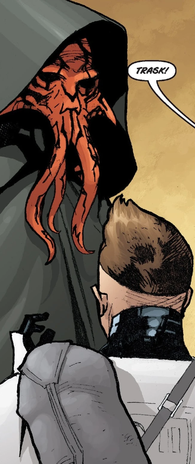 On the cover of Noob, Maleval has five suction-tipped fingers on each hand, while in the comic he has three clawed fingers on each hand instead.[1] Maleval is the second of three Quarren Sith Lords portrayed in Star Wars: Legacy, following an unidentified Quarren Sith[3] and preceding Darth Azard.[4]