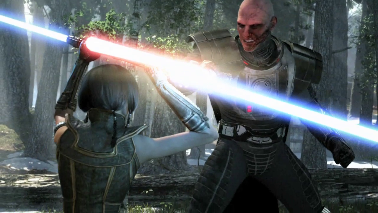 As she landed behind her friend, Shan unleashed a Force blast that sent the three Sith flying and drew Malgus's attention. The two enemies began to duel, with Malgus driving Shan to her knees with his powerful blows, but Shan brought a nearby tree crashing to the ground between them in order to force the Sith Lord back. As their duel continued, Malgus was able to cut Shan's new saberstaff in half, forcing her to block Malgus's lightsaber blade with her bare hands by absorbing the weapon's energy. Malgus was interrupted when Malcom tackled the Sith Lord, wrestling with him before revealing that he was holding a grenade in his hand. The resulting explosion threw Malcom backwards, while Malgus was able to withstand the blast despite scarring to his face. Shan then chose this moment to blast Malgus with the Force, throwing him into a nearby cliffside and then unleashing a second, more powerful blast that brought down the entire cliff on top of him.[17]