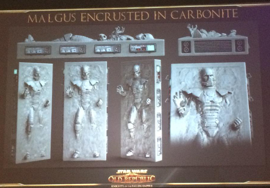 During San Diego Comic Con 2015 Cantina Tour, a fan-event hosted by BioWare, a clip and several concept arts of a cut scene from Star Wars: The Old Republic: Knights of the Fallen Empire cinematic trailer Sacrifice were showing Darth Malgus in carbonite, brought by Thexan and Arcann before the Emperor of the Eternal Empire, Valkorion. However, besides being mentioned, the character never appeared in the extension, which was released later that year on October 27.[40]