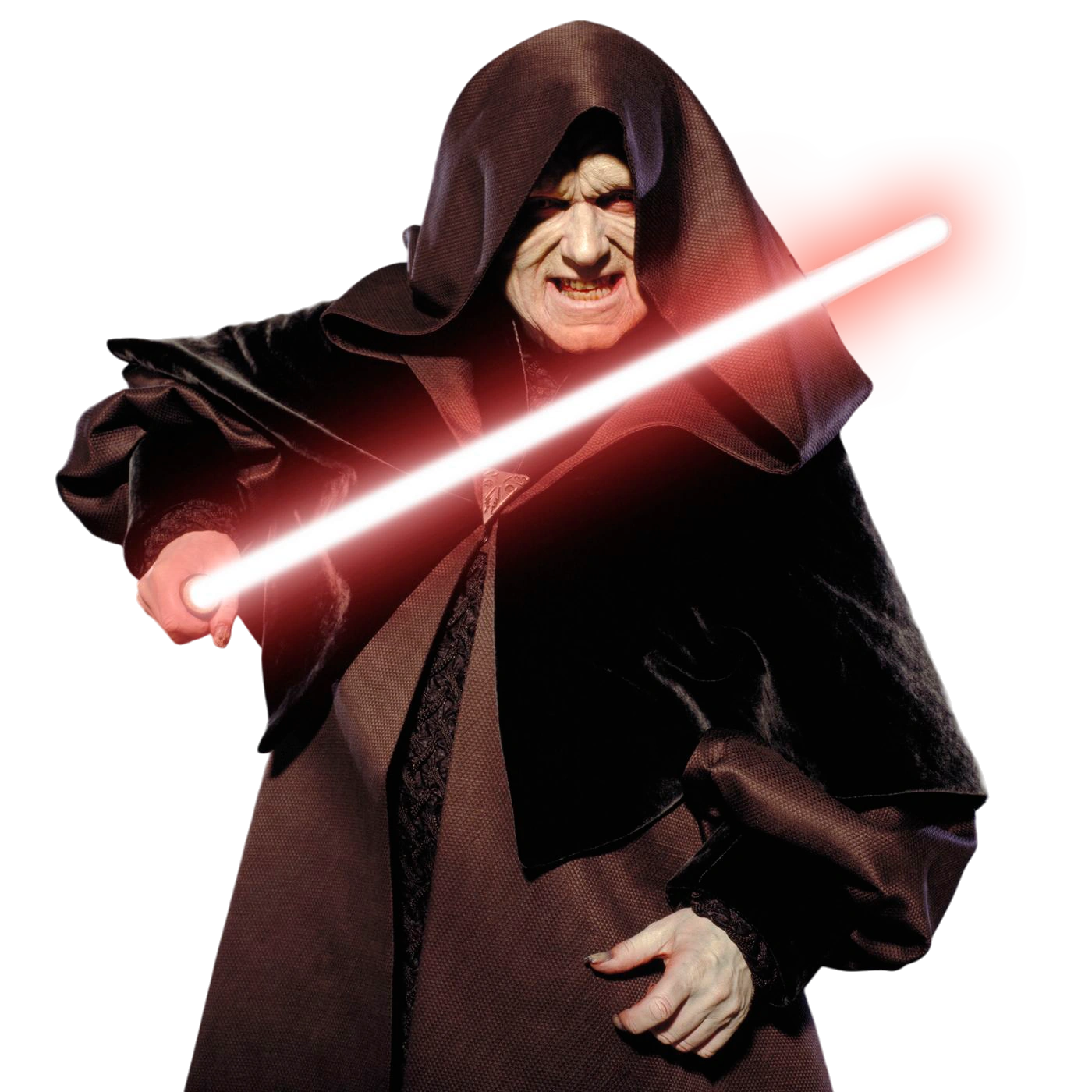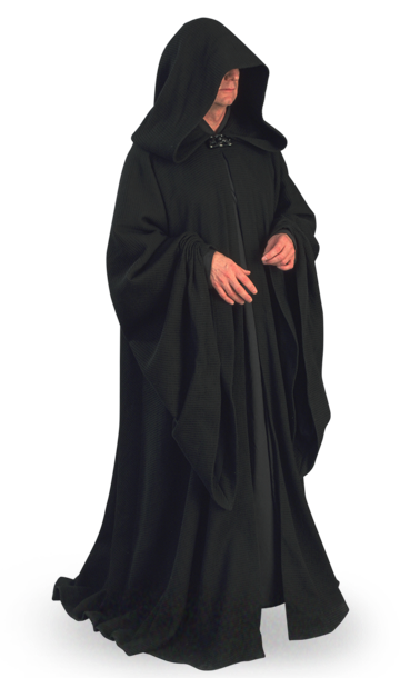 During the Naboo Crisis, Sidious wore an elaborate blue cloak. As Supreme Chancellor, he wore golden robes with a velvet overcloak in the days surronding the Battle of Geonosis and a dark crimson gigot-sleaved robe in the final days of the Clone Wars. As he rose to power he wore cloaks more infitting with Sith traditions, although without lessening his taste in lavish and comfortable fabrics. When declaring himself Emperor, Sidious wore a red robe patterned with emblems reminiscent of the serpents of the planet Moraband. As Galactic Emperor, he later wore a black zeyd cloth robe with a hood to hide his disfigured face. He used two identical lightsabers.[187]