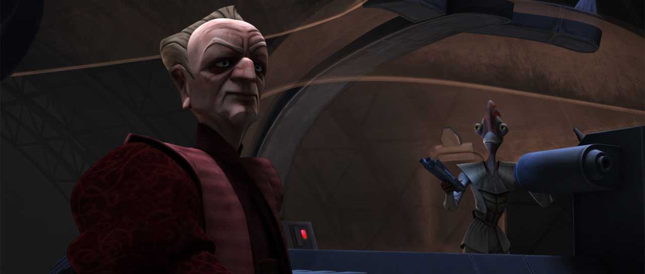 For the Star Wars: The Clone Wars film[53] and subsequent TV show, Darth Sidious was voiced by veteran actor Ian Abercrombie.[55] In the Creative Conservation commentary on the film's Blu-ray and audio commentary on the film's DVD, Director Dave Filoni noted that he found the fact that Palpatine and Jabba the Hutt were talking to each other fascinating. It was a character dynamic that he never thought would be seen.[203] Abercrombie passed away on January 26, 2012, leading to the legendary actor Tim Curry replacing him in the final seconds of "The Lawless"[71] as well as the remaining episodes of the series, for which he was credited, beginning the fifth season finale "The Wrong Jedi."[74]