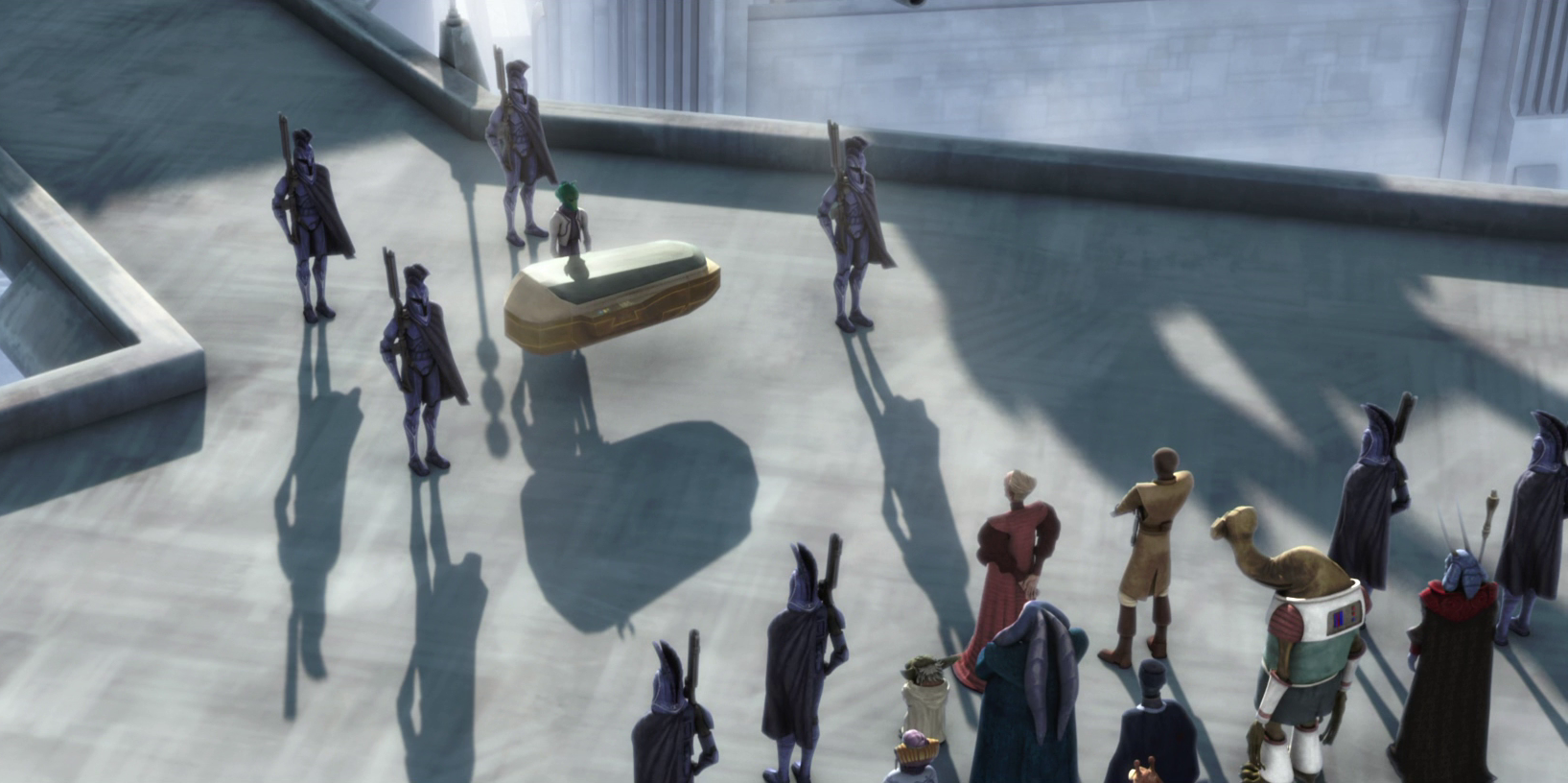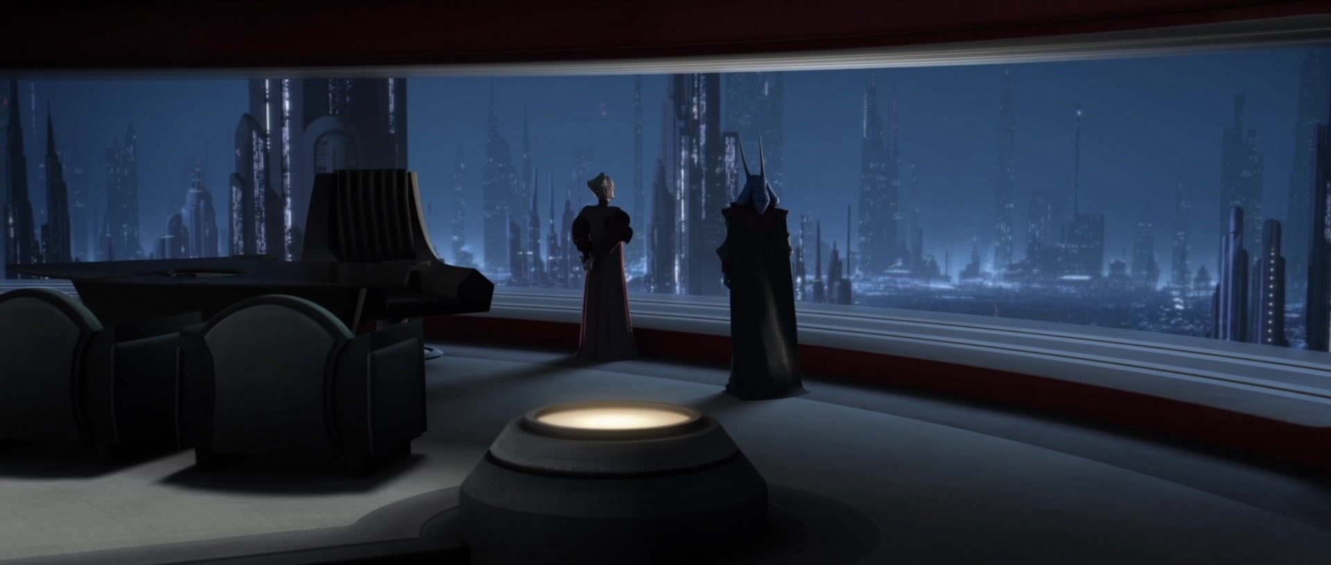 During the Republic Era, Sidious did not feel the need to hide in the lower levels of Coruscant, which he developed a personal dislike of. Instead, he preferred to remain amongst those who thought they were safe from the dark side. He would find the "weak points" of these places, ensuring the dark side took the light's place where-ever it was fading. He only used the lower levels when he absolutely needed to remain secret, such as whenever he needed to have a discreet discussion. Furthermore, he prefered to speak to his pawns via hologram, knowing that his in person presence could be overwhelming to people like Nute Gunray. He instead kept that advantage saved for whenever one of his "allies" was failing him. In public, as Senator of Naboo, he portrayed himself in a perfect state of blandness, looking interested in whatever was said nearby but never showing his true face. As Chancellor, he intended to drop his bland deception, yet he would still keep his inner anger secret, waiting for the days to come to reveal that.[22]