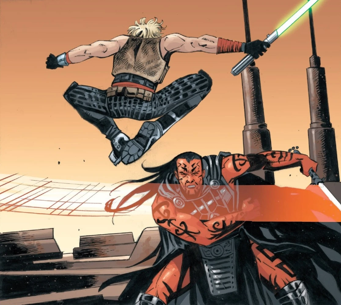 While Talon engaged Skywalker, Stryfe faced Skywalker's former master Wolf Sazen. Stryfe and Sazen attacked each other simultaneously, resulting in the deaths of both.[1] Skywalker continued his attack and succeeded in killing Lord Krayt, leading Darth Nihl to order the remaining Sith into hiding.[20]