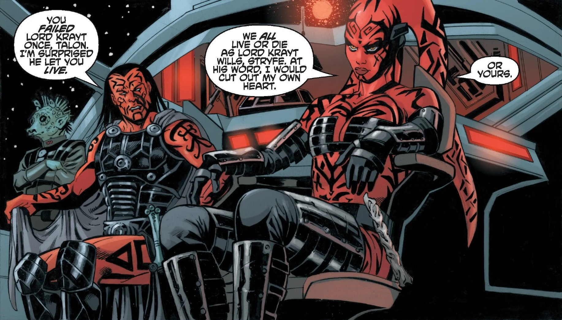 "We all live or die as Lord Krayt wills, Stryfe. At his word I would cut out my own heart. Or yours." - ―Darth Stryfe and Darth Talon