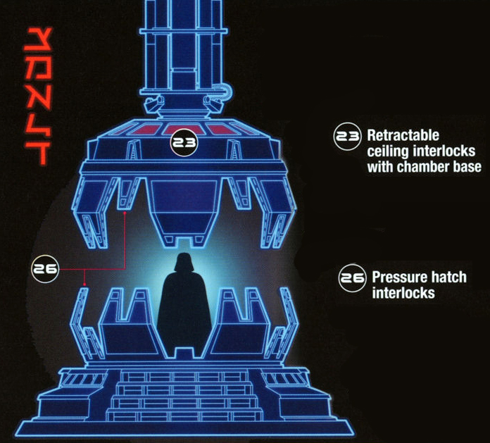 Not long after being entombed in his suit, Vader began to have moments of claustrophobia and felt a desperate need to emerge from the suit. Because of this, he had several chambers built—meditation pods—in which to do this.[18] He could only remove his mask[7] and rest[28] in a special hyperbaric medical chamber, such as the one on board his Star Dreadnought Executor. Allowing no one to assist him, Vader relied on mechanical devices to remove and replace his helmet and metal breath screen.[7] This pressurized life-support environment of medicated and oxygenated air allowed him to exist unmasked in some comfort.[28] To keep him alive, the surgical theater where he was revived as a cyborg must have had the same pressurized gas mix until his mask was sealed.[17] A small, retractable respirator tube enabled him to survive for a short time with the pod momentarily open.[11] The hyperbaric chamber had motion-sensitive controls[28] and was lifted by servo-lifts.[53] Vader's cape was lifted while in the meditation chamber, and it was mechanically lowered while he was still in the chair.[53]
