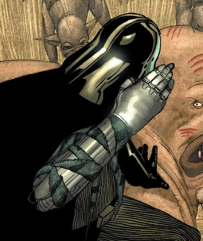 What remained of his real limbs ended in bulbs of grafted flesh, inserted into machines that triggered movement through the use of modules that interfaced with his damaged nerve endings.[18] The stumps of each organic limb were implanted with neural links that relayed muscle impulses between the brain and the limbs, allowing for the limbs to move under conscious control. The servomotors likewise were modeled after the human form, allowing for movement and rotation possible for various joint parts including the wrists, ankles and knuckles. The limb pistons likewise utilized hydraulic fluid to operate, and as such required a replenishment of fluid as well as a piston realignment every six months and diagnostic check-ins during the monthly maintenance sessions.[9] His mechanical appendages provided him with greater strength than an ordinary man; he could adjust the servodrivers and pistons in his forearms to provide his hands with enough strength to crush nearly anything they could grasp. With the power of his arms alone, he had the ability to lift an adult being off the ground, though he had always been able to do so with the Force, especially in moments of rage.[23] When put to use, his mechanical legs would allow him to leap a considerable distance.[18] His gloves incorporated a unique micronized iron that could deflect anything short of a lightsaber blow.[7]