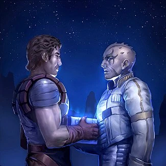 Charn's Falleen concerts proved uneventful and Rendar saw no sign of either Xizor or Kris among the crowds. During their stay on Falleen, news reached the group that the Nova's Heart was almost fully repaired and would be able to meet them two stops later at Bacrana. Rendar was concerned about a possible attack as the Millennium Falcon departed Falleen and carried out a thorough examination of the ship before leaving, during which he caught sight of somebody departing the ship through an airlock. Fearing that the being was a saboteur, Rendar gave chase, but soon realized that he was pursuing Charn. Rendar followed the singer to a Wayfarer's Temple in a ground level plaza, where he found her speaking to an Equilibrate priest in a small chapel. Taking cover behind a pillar, Rendar watched as the priest gave Charn a small data wafer. As Charn turned to leave, she made it clear that she was aware of Rendar's presence and he escorted her back to the ship. When he asked her what she was up to in the turbolift back to the landing pad, Charn claimed that she was an Equilibrate and that the data wafer contained a copy of the religion's holy book, the Fulcrum. Before Rendar could inquire further, the turbolift door opened to reveal a waiting Anomid assassin. Rendar closed the door, taking the turbolift back to street level moments before the assassin's Kerestian darkstick struck the door.[11]