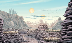 In Mandalorian culture, burials for the dead were uncommon, due to the inability for nomads to sustain cemeteries and the impracticality of bringing bodies with them on the move. However, the Mand'alor, leader of the Mandalorian clans, would be given a proper marked burial as a sign of respect, unless they chose otherwise.[5] Mass graves and cremation were common when a body could be recovered, with the ashes later scattered, and one of the fallen's possessions—often their armor—kept in memorial; if a full set of armor couldn't be recovered, it was commonplace to retrieve smaller parts such as helmets, gloves, or plates instead. It was also Mandalorian custom to recite the names of loved ones and friends who have passed each night before sleep as a means of keeping their memory alive.[6]