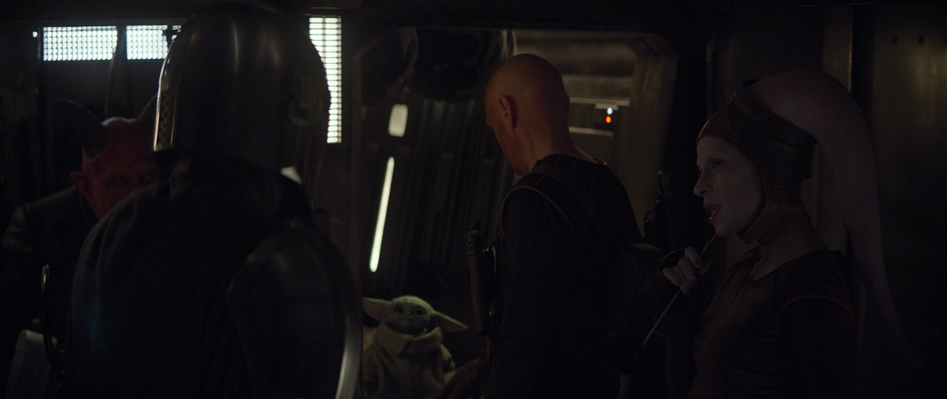 In search of credits, Djarin took on another assignment for an old mercenary friend named Ranzar Malk to rescue a Twi'lek prisoner named Qin, who had been arrested by the New Republic. Requiring the Razor Crest to complete the mission, Ranzar collected a crew of mercenaries made up of a former Imperial sharpshooter named Migs Mayfeld, a Devaronian named Burg, a skilled pilot droid Q9-0, nicknamed "Zero," and Qin's sister Xi'an. While en route to the New Republic Correctional Transport, the Bothan-5, Djarin hid Grogu within a compartment, which was discovered by the mercenaries accidentally when Burg opened up the sleeping quarters. Dumbfounded at what it was, Mayfeld was very curious about the child and even wondered if it came from the past relationship between Xi'an and Djarin. Mayfeld picked up Grogu jokingly claiming that he could keep it as a pet before pretending to drop it. As this happened, the Razor Crest exited hyperspace, and its current pilot, Zero, performed a risky docking maneuver that tossed the crew members around the vessel, including Grogu, who fell face first onto the deck of the Razor Crest before being protected by Djarin and placed back into his compartment before Djarin left with the other mercenaries to board the prison ship.[21]