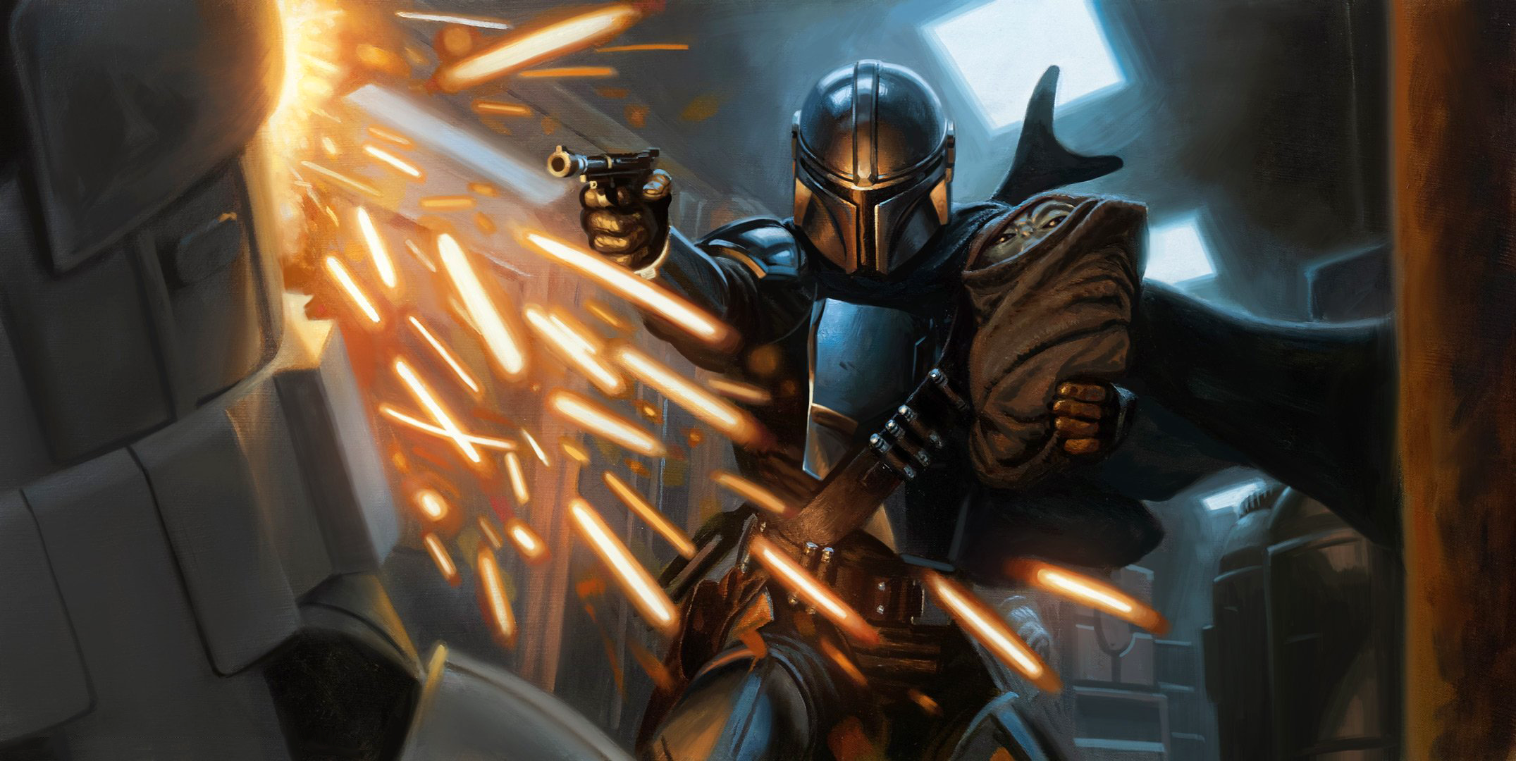 After learning of the Mandalorian's actions on Nevarro, inexperienced hunter Toro Calican kidnapped both Motto and Grogu in an attempt to blackmail Djarin. When Djarin arrived, he confronted Calican, who held his captives at gunpoint. Using a flare to blind his foe, Djarin flanked and shot him. Grogu hid in fright, but was immediately found again by Motto and Djarin. Djarin then left Tatooine with Grogu.[4]