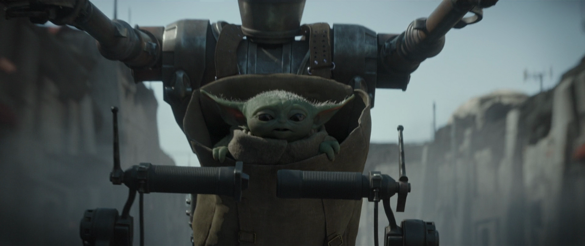 Realizing that the infant had been kidnapped and Kuiil was dead, IG-11 left the Razor Crest to fulfill his programming "to nurse and protect." The Imperial Scout troopers stopped at the outskirts of the city while they awaited orders from Moff Gideon, the Imperial leader that wanted Grogu in the first place. In the meantime, they harassed Grogu. IG-11 arrived and rescued the infant by taking out the pair of troopers. The droid, carrying Grogu with him, rode one of the 74-Z speeder bikes that belonged to the troopers, making its way to the city. As IG-11 drove through the city shooting the stormtroopers that had taken hold of Nevarro, Grogu laughed in delight.[7]